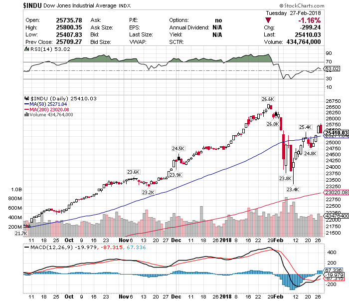 27日のNYダウ株式市場は前日比ー299.24ドル(ー1.16%)安の2万5410.03ドルと反落して取引を終えました。下落した主な要因はパウエル議長の議会証言を受けて、利上げペースが加速するのではとの懸念が高まったためです。