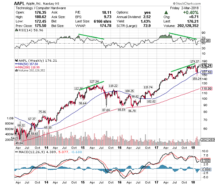 アップルの5年チャートです。株価の上値が切り上がっており、史上最高値付近で推移していますが、同時にRSIの上値が切り下がっていることが確認できます。こうしたダイバージェンス(逆相関の関係)は強気トレンドの最終局面に出やすいことから、近く調整する公算が大きいです。実際、14年末から15年6月にかけてダイバージェンスが発生したあと、株価は直近の高値127.34ドルから86.78ドルと約ー30%下げています。