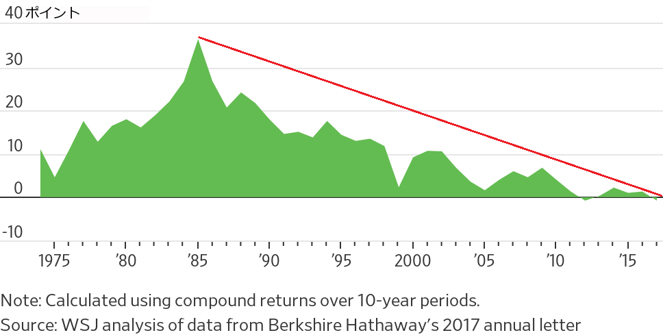 上のチャートは、バークシャー・ハザウェイに10年間投資した結果、S&P500種指数に利回りで何ポイント上回ったかを示したものです。例えば、1985年の36.5ポイントは、76年~85年にかけてバークシャー・ハザウェイに投資した場合、年平均リターンがS&P500種指数のそれを36.5ポイントも上回ったことを示しています。