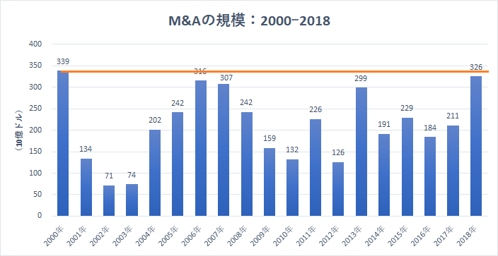 グラフは年初から2月末までのM&Aの規模の推移を表しており、今年のM&A規模はすでに3260億ドル(約34兆円)に達しています。これは2000年1~2月以来18年ぶりの規模です。