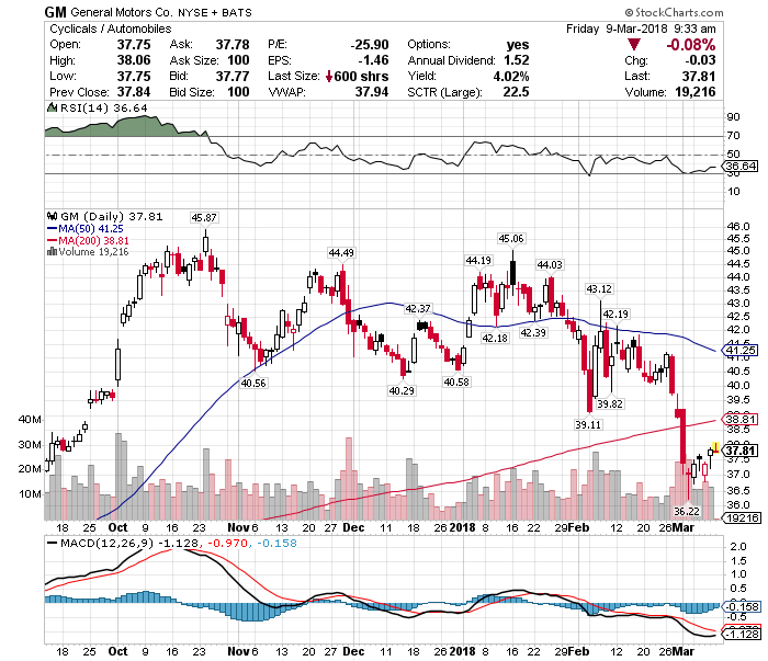 ゼネラル・モーターズの株価は1月の高値45.06ドルから、一時20%安となる36.22ドルまで下げる場面もありました。これは鉄鋼やアルミ価格の上昇を販売価格に転換すれば消費者が買い控えることが予想されますし、反対に販売価格に転換できなければ利益の圧迫要因になるので、いずれにせよマイナスの影響は不可避として将来の業績への懸念が高まっているためです。
