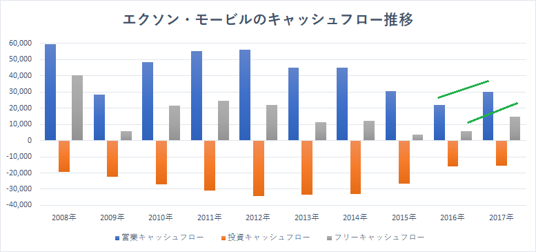 さて、こうした株価の上がらない不人気銘柄を投資家は保有するべきでしょうか。投資の目的やリスク許容度が人それぞれ違うことを考えれば一概には言えることではありませんが、バフェット太郎のように配当再投資戦略を実践しつつ、資産と配当収入の最大化を目指している投資家は売る必要はありません。なぜなら、エクソンは依然として安定したキャッシュフローを稼ぐことのできるブルーチップ(優良株)だからです。