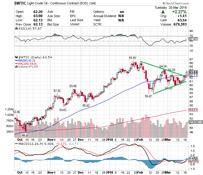 またチャートを眺めると、これまで三角保合いを形成していましたが、レジスタンス(上値抵抗線)をブレイクアウトし、さらに50日移動平均線を上回ったことで買いシグナルが出ました。足もとでは米国の原油生産が増加していることや不安定な株式市場が上値を重くすることが予想されるものの、2月からの調整局面は脱しつつあります。