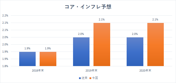 また、FOMCメンバーによる、2018年末のコア・インフレ率(価格変動の大きい食品やエネルギーを除いた物価上昇率)は従来の1.9%から1.9%と修正されなかったものの、2019年末は従来の2.0%から2.1%に上方修正され、2020年末も従来の2.0%から2.1%に上方修正されました。