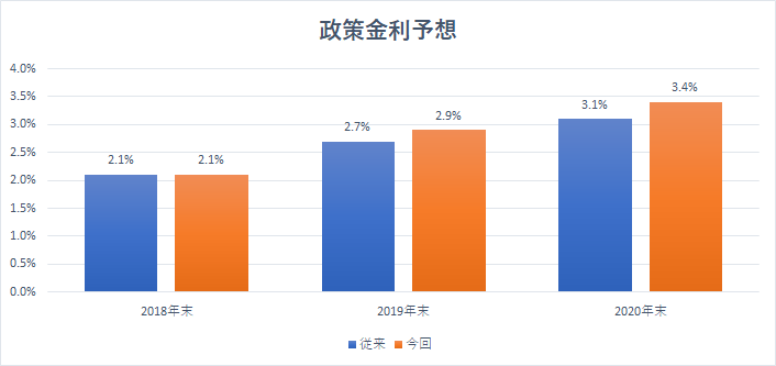 最後に、FOMCメンバーによる2018年末の政策金利予想は従来の2.1%から2.1%に据え置かれたものの、2019年末は従来の2.7%から2.9%に上方修正、2020年末は従来の3.1%から3.4%に上方修正されました。