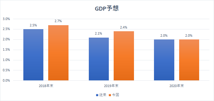 加えて、FOMCメンバーによる2018年末のGDP予想は従来の2.5%から2.7%に上方修正、19年末は従来2.1%から2.4%に上方修正、2020年末は従来の2.0%から2.0%に据え置かれました。