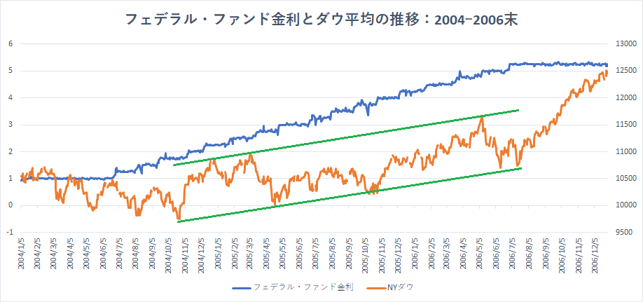 【フェデラル・ファンド金利とダウ平均の推移:2004ー2006】