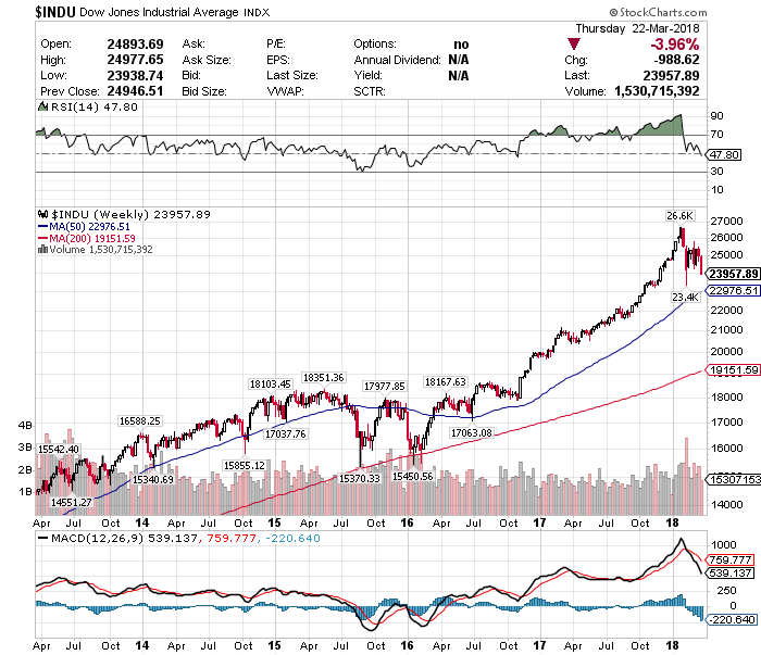 22日のNYダウ株式市場は前日比ー724.42ドル(ー2.93%)安の2万3957.89ドルと急落して取引を終えました。急落した主な要因は、中国の知的財産権侵害を巡る問題で、トランプ大統領が最大600億ドル(約6兆3000億円)規模の中国製品に対し、25%の関税を課すことを目指す大統領覚書に署名したことが嫌気されたためです。