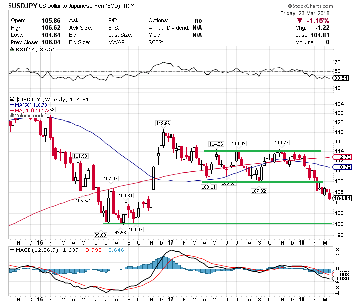 ドル円の週足チャートです。昨年は108円~114円のレンジでボックス相場を形成していましたが、2月の調整局面で下にブレイクアウトすると円高が加速しました。