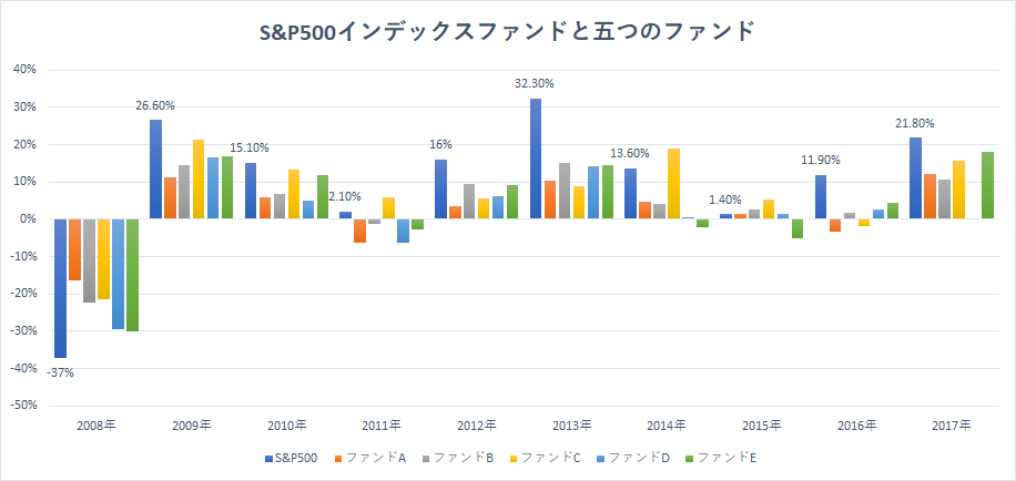 S&P500インデックスファンドは、2008年こそ五つのファンドに負けたものの、その後は安定して勝ち続け、10年間のうち6回で五つのファンド全てにアウトパフォームし、10年間のうち8回で五つのファンドの平均リターンを上回りました。