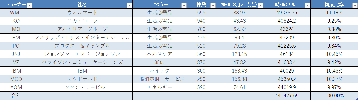 バフェット太郎は米国の超大型連続増配高配当株10社に均等分散投資し、毎月最後の金曜日に構成比率最低銘柄を約5000ドル買い増すことで均等になるようにリバランスしています。現在、バフェット太郎の構成比率最高銘柄トップ3は上からウォルマート(WMT)の11.2%、ジョンソン・エンド・ジョンソン(JNJ)の10.5%、IBMの10.4%となっており、最低銘柄トップ3は下からコカ・コーラ(KO)の9.2%、プロクター&ギャンブル(PG)の9.3%、ベライゾン・コミュニケーションズ(VZ)の9.4%となっているので、4月はこの三銘柄のいずれかを買い増すことになりそうです。
