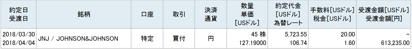 3月はヘルスケア大手のジョンソン・エンド・ジョンソン(JNJ)の株式を一株127.19ドルで45株(約61万円分)買い増しました。