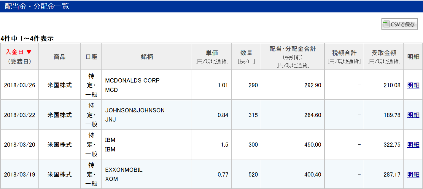3月はマクドナルド(MCD)、ジョンソン・エンド・ジョンソン(JNJ)、IBM、エクソン・モービル(XOM)の4社から合計1407.9ドル(約15万円)、税引き後で1009.78ドル(約10万7000円)