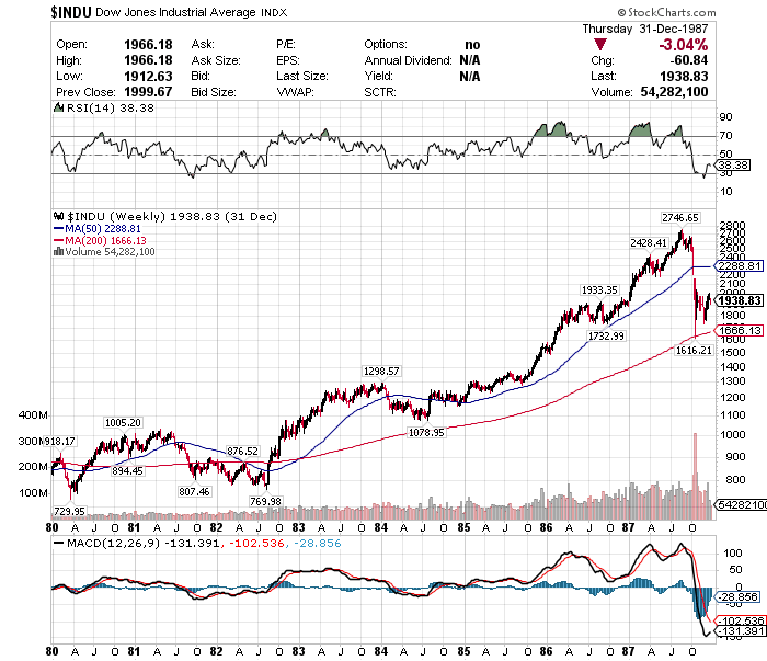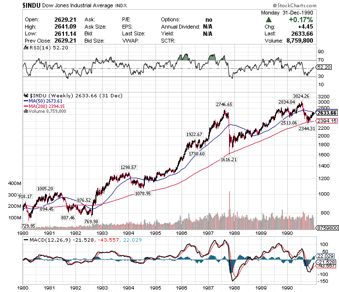なぜ、アナリストらが大暴落が待ち受けていると指摘したかと言うと、1929年の世界恐慌は株価が高値の380ドルから41ドルと約90%も大暴落したからです。そのため、1987年のブラック・マンデー後の株式市場も同様に90%近い大暴落に見舞われると考えられたためです。【1980ー1990】