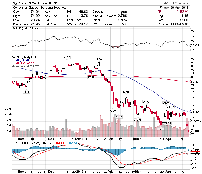 競争激化により販売価格が低迷していることが嫌気されて株価は今年高値の91.08ドルから73.80ドルと約二割値下がりしています。全部門で幅広く値下げが見られ、特に「ジレット」ブランドを保有するカミソリ事業の販売価格は3%も低下しました。これは低価格の定期購入サービスを提供するダラー・シェーブ・クラブ社(ユニリーバが買収)やハリーズ社に対抗するためです。