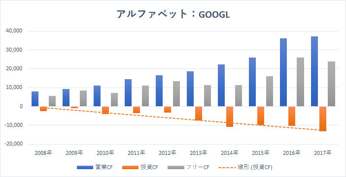 投資CFは年々増加していることから、フリーCFが伸び悩んでいます。アルファベットの予想PERが26倍であることを考えると、それほど割高感は感じられませんが、投資家らは新たな規制や設備投資の増加を懸念して、「買い」に躊躇しているのかもしれません。