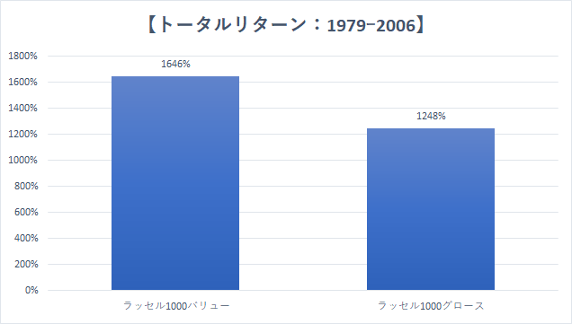 しかし、本当にそうでしょうか。79年から06年までの27年間においてバリュー株のトータルリターンが1646%とグロース株の1248%を大きく上回っていたことを考えると、バリュー株投資がシニア投資家のための投資戦略で、若年投資家はグロース株投資にすべきとの意見は間違っていることがわかります。