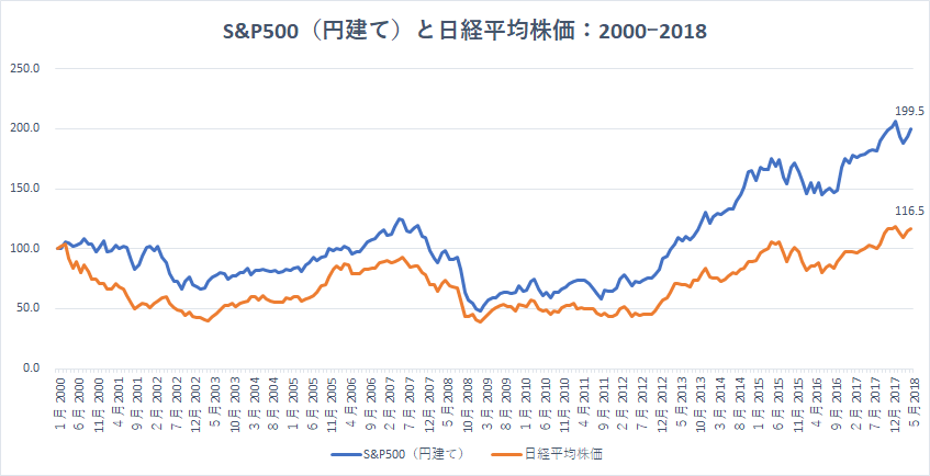 【S&P500(円建て)と日経平均株価:2000ー2018年5月】