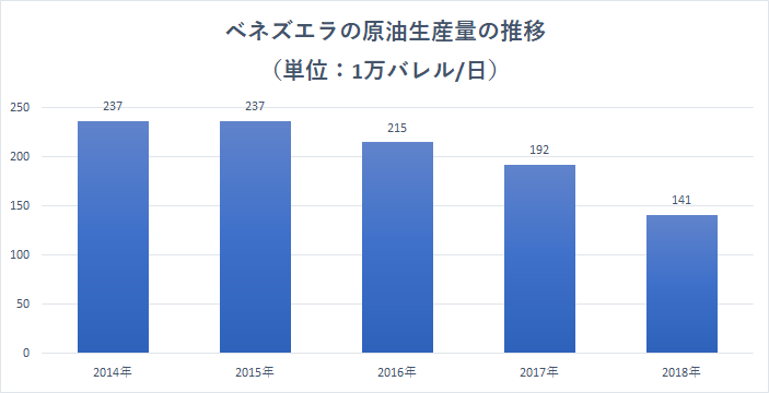 ベネズエラの原油生産量の推移を眺めると、14年の日量237万バレルをピークに141万バレルと約4割減少していることがわかります。