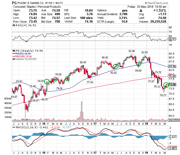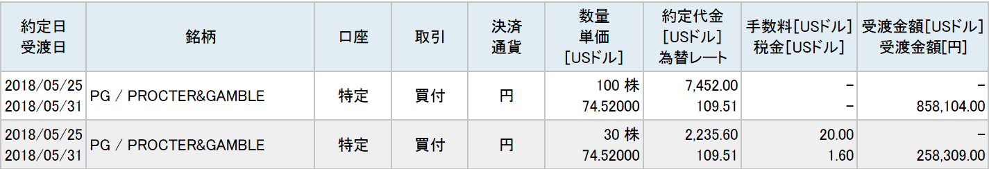 日用品世界最大手のプロクター&ギャンブル(PG)の株式を一株74.52ドルで130株、約9700ドル(約110万円)分買い増しました。