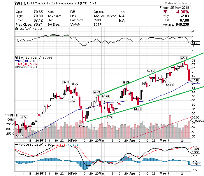 原油先物チャートを眺めると、50日移動平均線を試す展開となっています。これを割り込めば66ドルがターゲットになります。