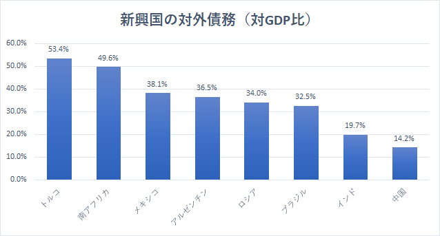 仮にトルコで通貨危機による企業のデフォルト連鎖が始まれば、投資家らは「第二のトルコ」を探し始め、対外債務が対GDP比で同様に大きい新興国が売りを浴びせられる可能性が高いです。