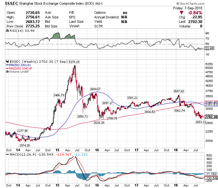 新興国株の代表格でもある中国株は、トランプ大統領が対中制裁関税の拡大を示唆していることから弱気相場入りしています。米国は中国が「通貨」と「技術」の分野で覇権を握ろうとしていることから、対中制裁を強化し、そうした野望を握り潰そうとしているわけです。