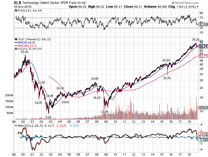 これはドットコムバブル崩壊以降を思い出して欲しいんですけれども、たとえば、ハイテク株ETFの「テクノロジー・セレクト・セクターSPDR(XLK)」はドットコムバブル崩壊で株価が80%も暴落し、その後当時の高値まで値を戻すのに17年もの歳月がかかっているわけです。(この間ハイテク市場は急成長していたのにも関わらず!)