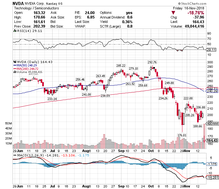 四半期決算に失望売りが広がり、株価は前日比ー18.76%安と暴落。10月の高値292.76ドルからわずか一カ月半でー43.8%安と大暴落しています。