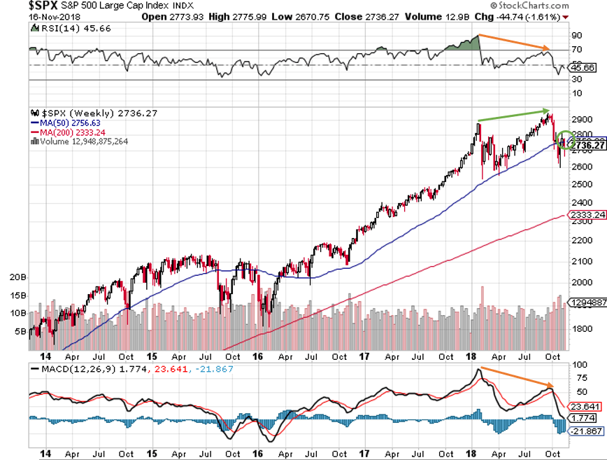 S&P500ETFの週足チャートを眺めると、株価の上値が切り上がっている一方、RSIとMACDの上値が切り下がっている逆相関の関係が見られます。これは強気相場の最終局面に表れやすいサインです。また、50週移動平均線をすでに下回っていることを考えると、米国株の強気相場は終わりを迎えつつあることが予想されます。