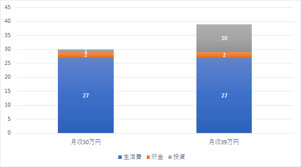 仮にどちらも毎月2万円の貯金をしたとすると、月収30万円の人が投資に回せるお金は1万円であるのに対して、月収39万円の人は10万円も回せるため、二人の格差は10倍にもなります。