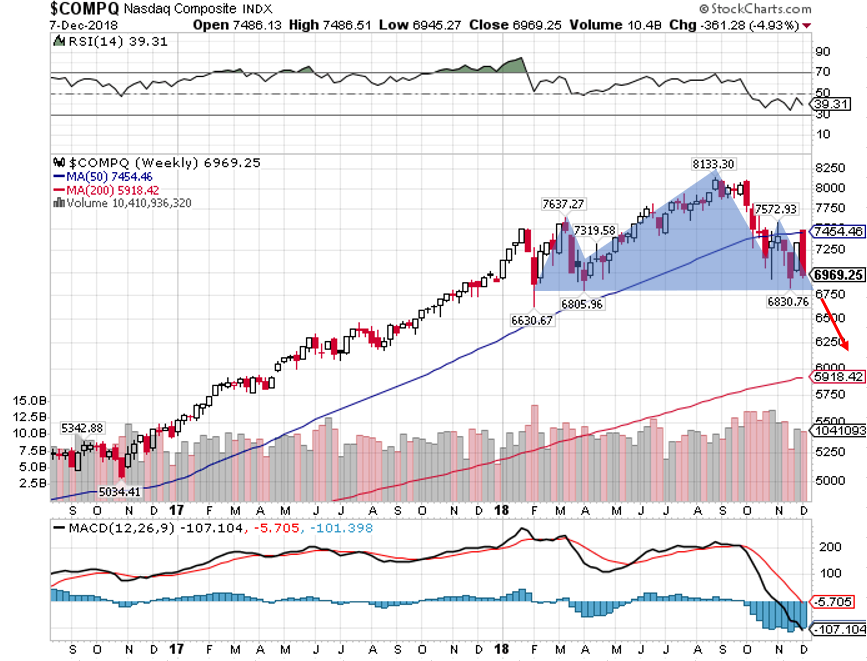 今回の逮捕を巡って、米企業幹部は中国から報復される可能性を懸念して、中国への出張を急遽キャンセルしています。 これまで相場の牽引役となってきたナスダック総合株価指数は今週一週間でー4.93%値下がりしました。チャートを眺めると、強気相場の天井を示すヘッド&ショルダーを形成していることに加えて、50週移動平均線に跳ね返されていることから、6800ポイントを下回るかどうかが注目されています。