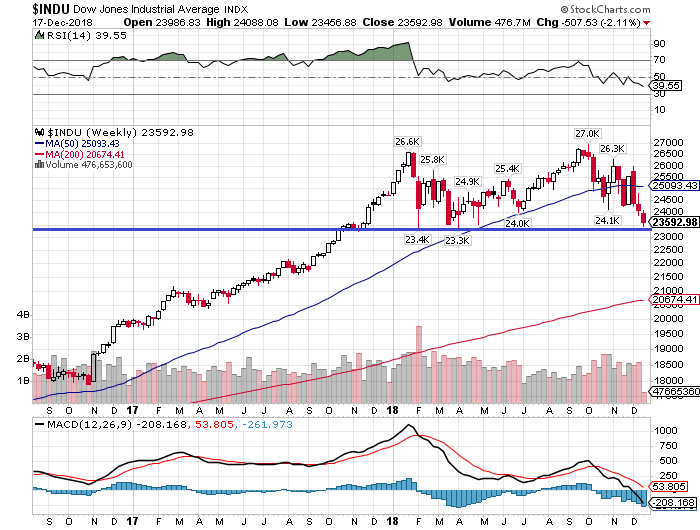 ダウ平均は直近の高値から-12.5%安と調整局面入り入りし、4月の安値2万3300ドルに接近しています。当面はこれがサポートラインになるので、この水準を割り込めば200週移動平均線の2万0674ドルがターゲットになります。