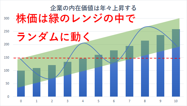 しかし、長期的に見れば企業の内在価値は年々上昇し、緑のレンジもそれに伴い上昇するので、株価が0年目の水準に戻るなんてことはなくなっていきます。