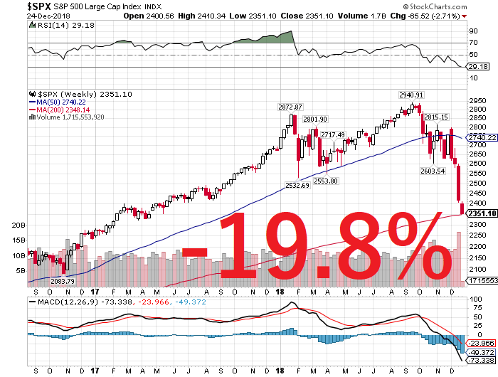 24日、クリスマスイブのNYダウ株式市場は前日比ー653.17ドル(-2.9%)安の2万1792.20ドル、S&P500種指数は-65.52ポイント(-2.71%)安の2351.10ポイント、ナスダック総合指数は-140.07ポイント(-2.21%)安の6192.92ポイントと三指数揃って急落しました。