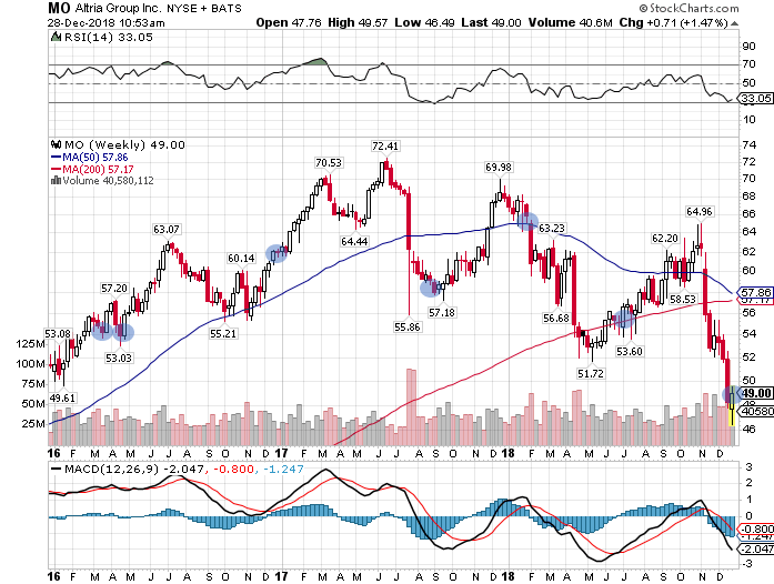 こうした先行き不透明感が嫌気されて、アルトリア株は17年の高値72.41ドルから一時46.49ドルと-35.8%も大暴落しました。