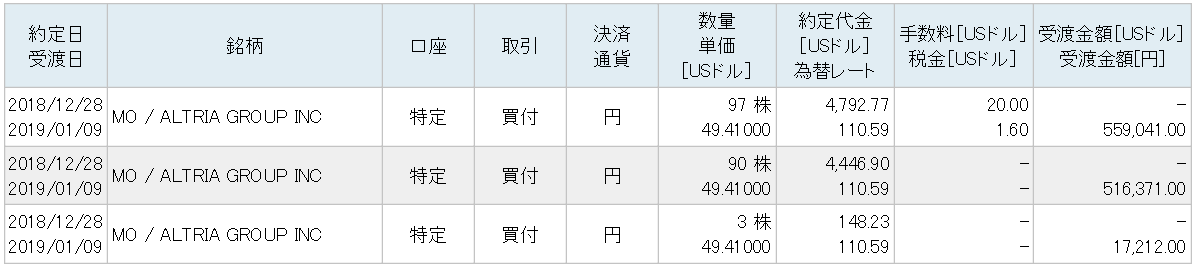 米たばこ最大手のアルトリア・グループ(MO)の株式を一株49.41ドルで190株、約9400ドル(約109万円)分買い増しました。