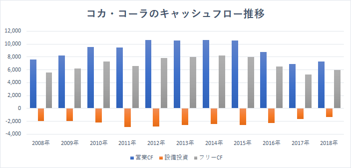 コカ・コーラのキャッシュフローの推移を眺めると、本業の儲けを表す営業キャッシュフローが下落基調だったものの、底打ちの兆しを見せています。