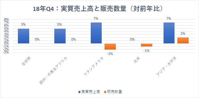 また、販売数量は全世界で±0%、欧州・中東&アフリカは-2%、ラテンアメリカは-2%、北米は-1%、アジア・太平洋は+2%でした。