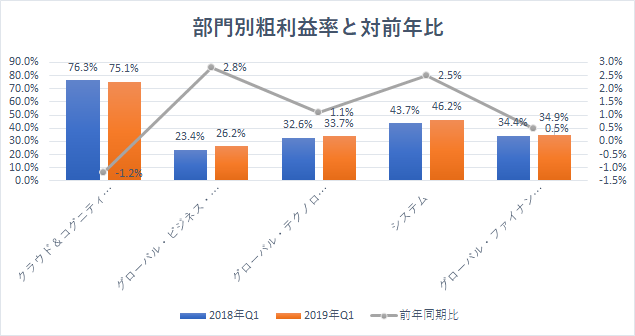 部門別粗利益率は「クラウド&コグニティブ・ソフトウェア」が75.1%と、前年同期比-1.2%ポイント低下した一方、「グローバル・ビジネス・サービス」と「グローバル・テクノロジー・サービス」はそれぞれ同+2.8%ポイント、+1.1%ポイントと上昇しました。