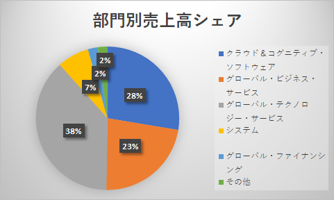 IBMは主に三つの事業から成り立っており、「クラウド&コグニティブ・ソフトウェア」が28%、「グローバル・ビジネス・サービス」が23%、「グローバル・テクノロジー・サービス」が38%と、この三大事業が売上高全体のおよそ9割を占めています。