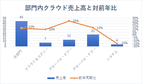 全部門のクラウド事業の売上高は45億ドルと前年同期比+12%の増収でした。