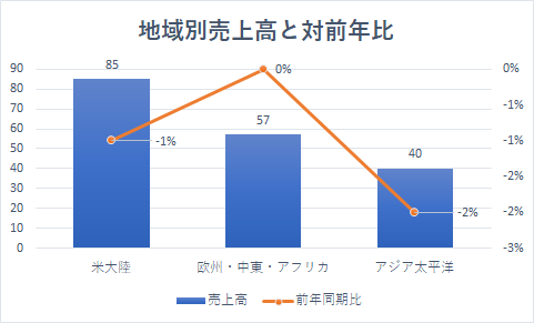 地域別売上高は主力地域の米大陸がー1%の減収だった他、アジア太平洋も-2%の減収と不振でした。アジア太平洋が不調だった主な要因は、顧客が製品・サービスの購入決定を遅らせたことが原因です。