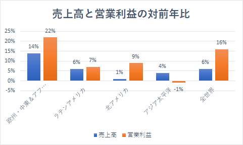 ラテンアメリカ部門のオーガニックセールスは+6%、為替の影響を除いた営業利益は+7%と好調でした。販売数量が-1%の減少だった一方、ブラジルやアルゼンチンなど、ほぼすべての地域で価格が上昇したことが寄与しました。
