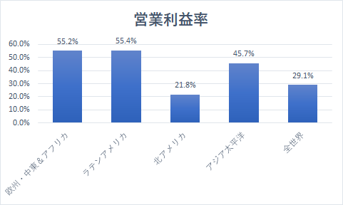 営業利益率は全世界で29.1%、地域別では欧州・中東&アフリカ、ラテンアメリカ、アジア太平洋でおよそ50%と、非常に強固な競争優位性を持っていると言えます。