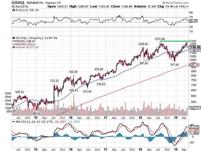 アルファベットの株価は売上高成長率の鈍化が嫌気されて、前日比-7.50%安の1198.96ドルと急落して取引を終えました。また、チャートは強気相場の天井を示す売りシグナルであるダブルトップを形成したことから、一段と下落する公算が大きいです。