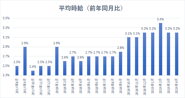 平均時給(前年同月比)は予想+3.3%に対して、結果+3.2%と予想を下回りました。