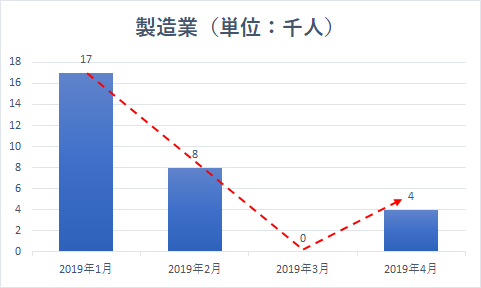 米中貿易摩擦による悪影響が心配されている「製造業」は+4000人と持ち直しの兆しを見せています。