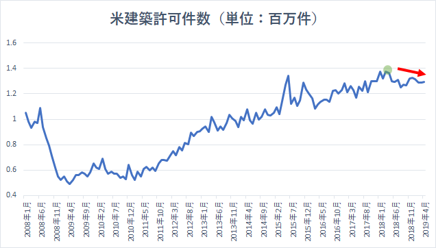 そのため、4月の数字が予想を上回ったことに加えて3月分が上方修正されたことから、米住宅市場は引き続き底堅く推移し、米景気の拡大期は続くと考えられるわけです。ただし、18年3月をピークに徐々に上値が切り下がっていることは憂慮すべきです。