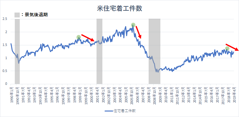 ただし、過去を振り返ると住宅着工件数がピークをつけてからおよそ1~2年後にリセッションが訪れていたことを考えると、住宅着工件数が18年5月にピークをつけて下落基調が続いていることは憂慮すべきです。